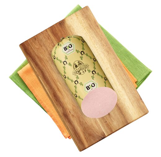 Bio-Mortadella, auch Lyoner genannt. Hergestellt aus edlem Bio-Schweinefleisch.