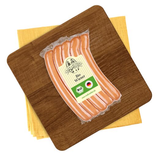 Fünf knackige Wiener aus Bio-Schweinefleisch. Leicht geräuchert über Buchenholz.