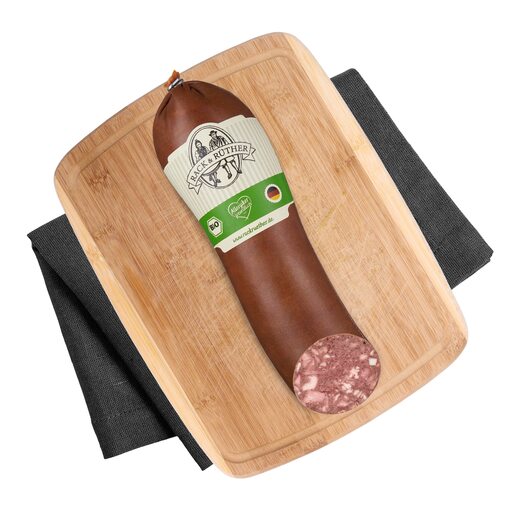 Klassische Blutwurst im Textildarm. Hergestellt aus edlem Bio-Schweinefleisch.