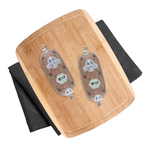 Klassische grobe Leberwurst im Mini-Format. Hergestellt aus edlem Bio-Schweinefleisch.